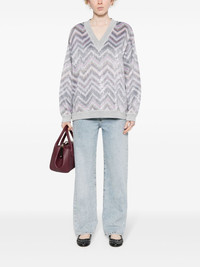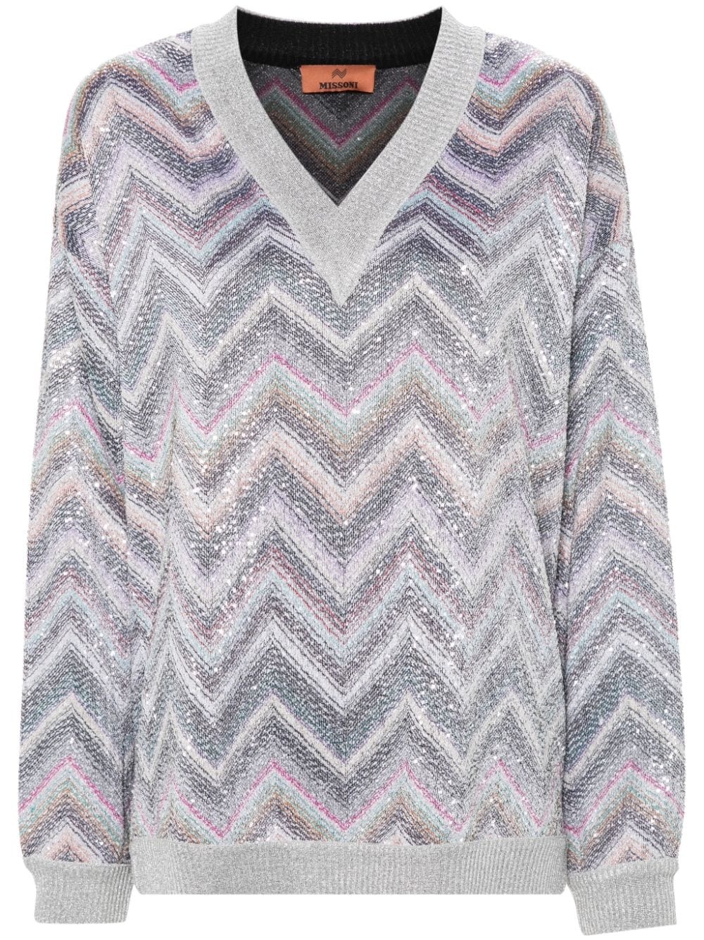 zigzag sequin-embellished jumper Highlights - Grey/multicolour - Metallic threading - Sequin embellishment - Signature zigzag woven design - V-neck - Drop shoulder - Long sleeves - Ribbed cuffs and hem - Short side slits - Internal logo tag - Straight hem - The item you receive may differ slightly from the item photographed. this is due to the artisanal nature with which all missoni products are constructed. Made in Italy Composition Outer: Viscose 45%, Polyester 29%, Polyamide 26% Lining: Polyamide 100% SIZE & FIT Model measurements Height 5 ft 9 in(1.75 m) Bust/Chest 34.64 in(88 cm) Hips 36.61 in(93 cm) Waist 26.37 in(67 cm) FittingInformation Designed to be unstructured, offering a loose fit throughout Made with a midweight knit, this piece offers some stretch This piece fits true to size – take your usual size Washing instructions Dry Clean Only