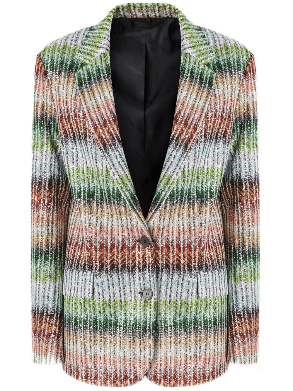zigzag-woven blazer Highlights - Green - Front button fastening - Sequin embellishment - Two front flap pockets - The item you receive may differ slightly from the item photographed. this is due to the artisanal nature with which all missoni products are constructed. Made in Italy Composition Outer: Rayon 47%, Polyamide 26%, Polyester 20%, Metallic Fibre 7% Lining: Rayon 100% Washing instructions Read Manufacturer Guidelines