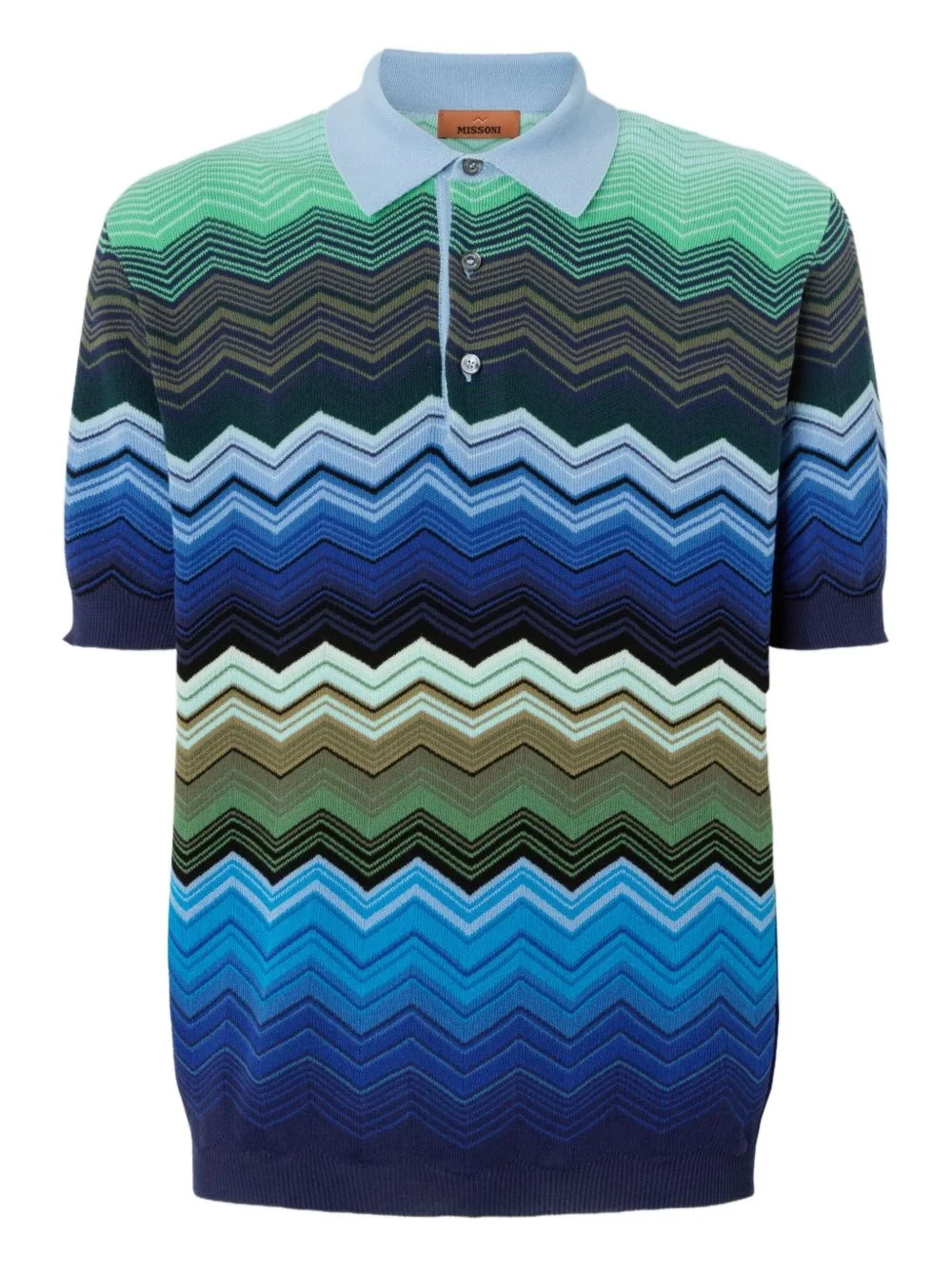 zigzag-woven polo shirt Highlights - Ocean blue - Front button placket - Short sleeves - Ribbed cuffs and hem - Contrasting collar - The item you receive may differ slightly from the item photographed. this is due to the artisanal nature with which all missoni products are constructed. Made in Italy Composition Cotton 100% SIZE & FIT FittingInformation Designed for a relaxed fit, this polo shirt offers comfort and movement The ribbed hem offers a close, comfortable fit Made with a midweight knit, this piece offers some stretch Washing instructions Hand Wash