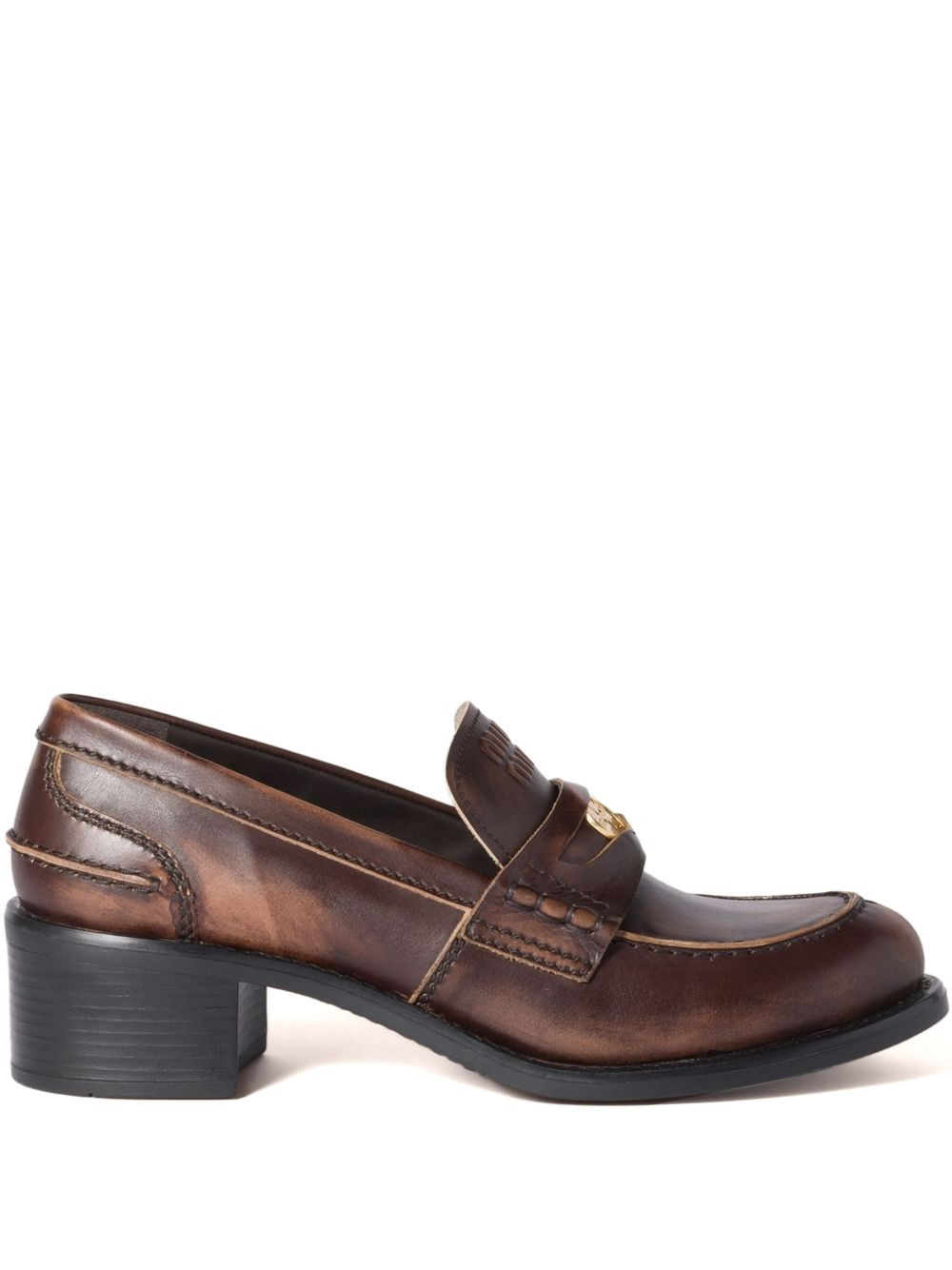50mm leather band coin loafers Highlights - Brown - Leather - Embossed logo - Gold-tone coin detail - Block heel Composition Outer: Calf Leather 100% Lining: Calf Leather 100% Sole: Rubber 100% SIZE & FIT Measurement HEEL 1.96 in(5 cm)