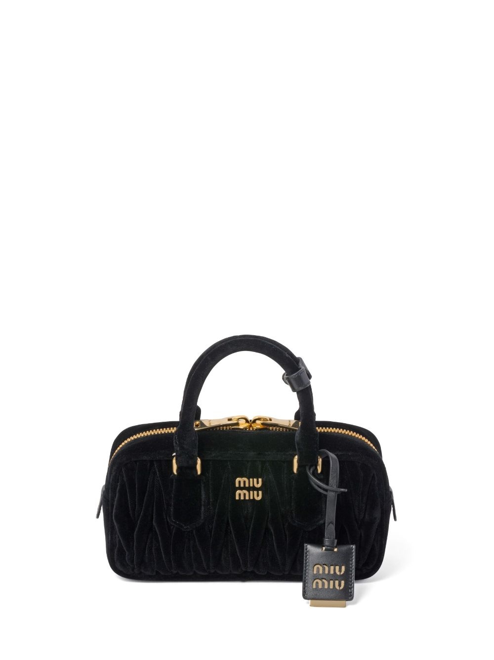 Arcadie matelasse vevlet tote bag Miu Miu revisits its iconic house codes in this Arcadie velvet tote bag. Its sophisticated matelasse motif offers a three-dimensional, textured effect topped by a logo plaque in the front – where dynamic and elegant lines meet. Highlights - Black - Velvet - Gold-tone hardware - Matelasse effect - Logo plaque - Luggage tag - Top zip fastening - Two top handles - Adjustable detachable shoulder strap - Main compartment Composition Outer: Velvet 100%