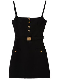 belted wool minidress Merging a '60s-inspired silhouette with utilitarian codes, this Miu Miu minidress is crafted from black stretch virgin wool. Three-dimensional buttons punctuate the front of the garment, while a logo buckle belt accentuates the waist. Highlights - Black - Wool - Spaghetti straps - Square neck - Decorative button detailing - Belted waist - Logo-buckle detail - Two front welt pockets - Rear zip fastening - Straight hem - Thigh-length - Gold-tone hardware Composition Outer: Virgin Wool 98%, Elastane 2% Lining: Recycled Polyester 100% Washing instructions Read Manufacturer Guidelines