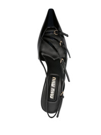 buckle-embellished slingback pumps Miu Miu's rebellious spirit meets a classic silhouette in these black pumps. Gold-tone buckles accent the multi-strap design, which is crafted from patent leather with a point toe and a tapered heel. Highlights - Black - Calf leather - Patent finish - Decorative buckle detail - Buckle-fastening slingback strap - Pointed toe - Branded leather insole - Kitten heel Composition Outer: Patent Calf Leather 100% Sole: Calf Leather 100%, Rubber 100% Lining: Calf Leather 100% SIZE & FIT Measurement HEEL 2.75 in(7 cm) Sole height 0.39 in(1 cm)