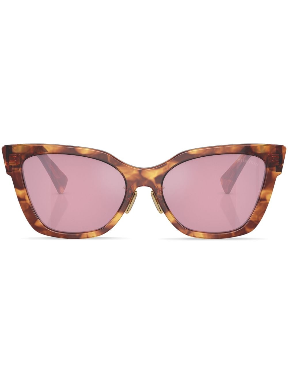 cat-eye frame sunglasses Miu Miu Eyewear captures their whimsical spirit through these oversized cat-eye sunglasses. Enhanced with a timeless tortoiseshell effect, they boast pink lenses and a logo accent at the temples. Highlights - Tobacco brown - Acetate - Tortoiseshell effect - Cat-eye frame - Pink tinted lenses - Nose pads - Logo print at the arm - Straight arms - Curved tips - These glasses come with a protective case. Composition Acetate 100% SIZE & FIT Measurement Arm Length 5.51 in(14 cm) Bridge Width 0.7 in(1.8 cm) Lens Diameter 2.2 in(5.6 cm) Total Width 5.9 in(15 cm)
