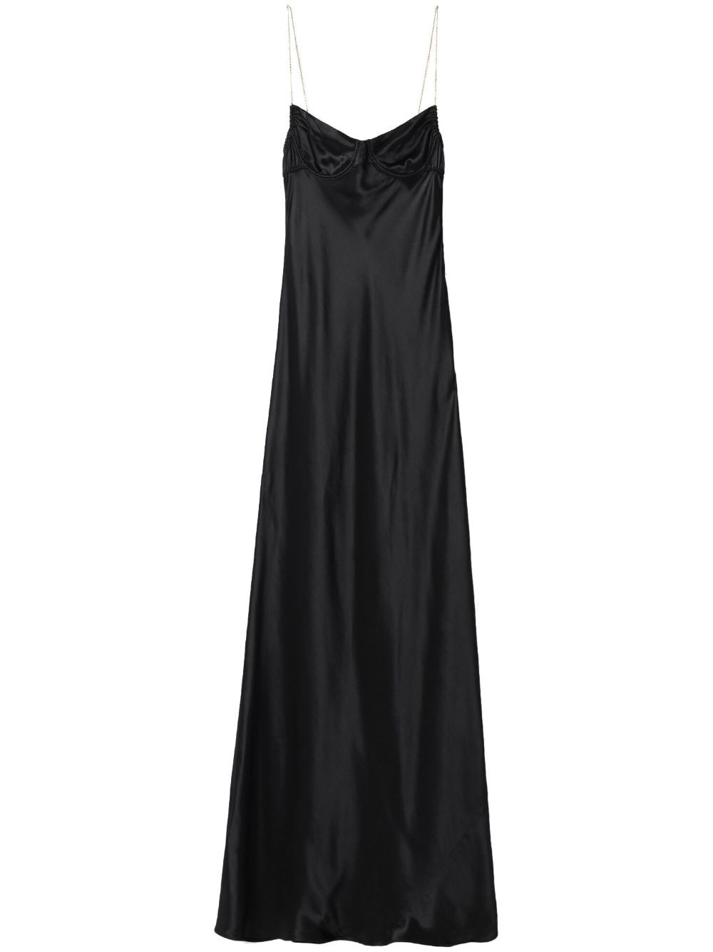 chain-straps silk dress Miu Miu dives into evening wear, maintaining its signature minimalist and refined take on fashion. This maxi dress is crafted from silk satin and highlighted with gold-tone chain-link straps and a bustier-style neckline. Highlights - Black - Silk satin - Applique logo - Bustier-style neckline - Two chain-link shoulder straps - Long length - Gold-tone hardware Composition Silk 100% Washing instructions Read Manufacturer Guidelines