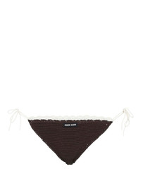 crochet-knit embroidered-logo bikini bottoms Boasting a crochet-knit construction for a whimsical and summer-inspired look, these bikini bottoms from Miu Miu are decorated with an embroidered logo at the front. Highlights - Chocolate brown - White - Cotton - Crochet knit - Embroidered logo to the front - Side tie fastening - Be mindful to try on swimwear over your own garments. Composition Cotton 100%