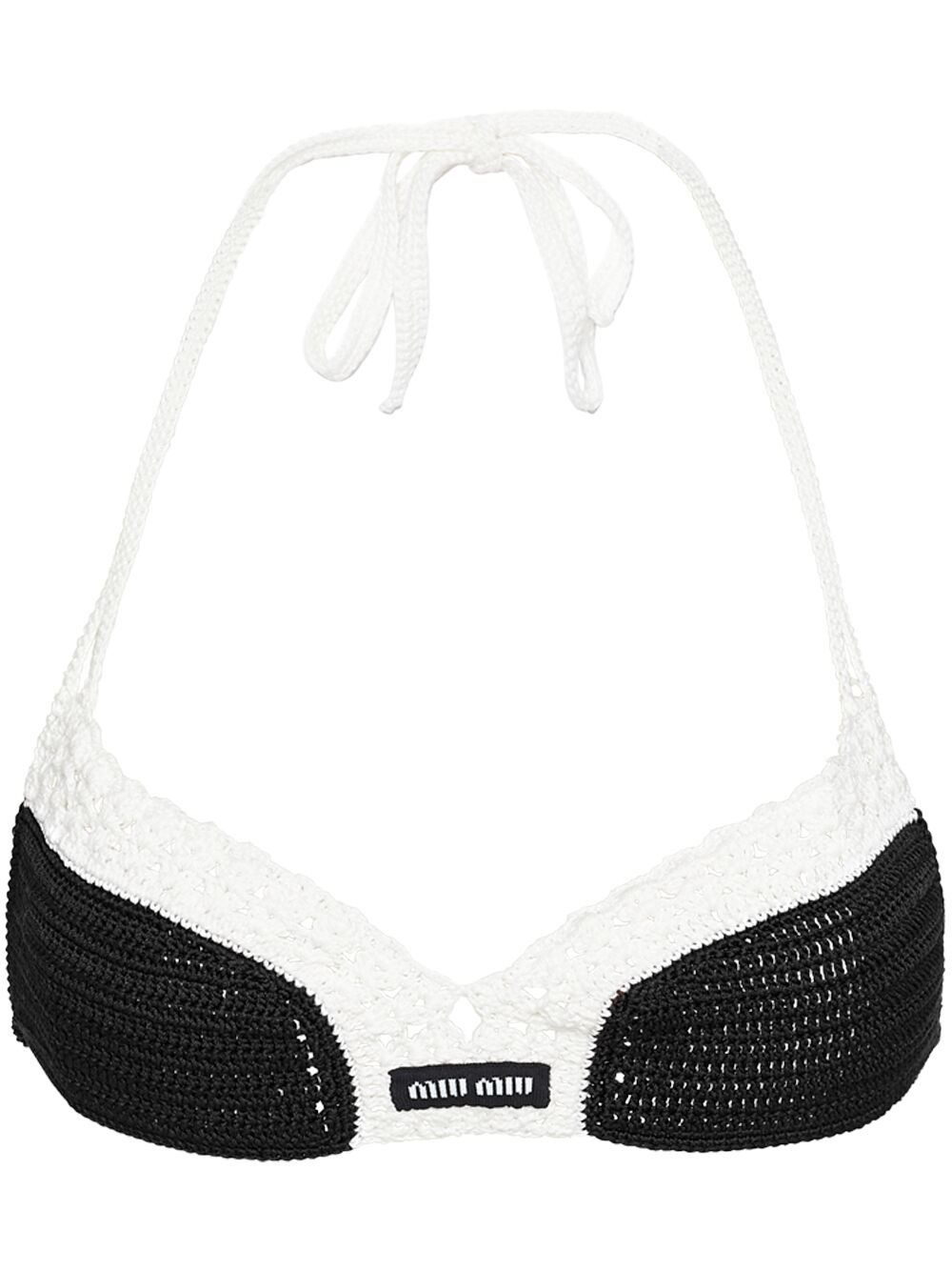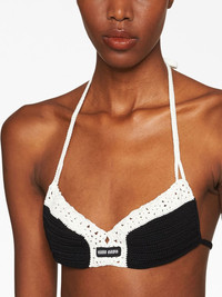 crochet-knit triangle bralette Miu Miu’s triangle bra is handcrafted from two-tone cotton to an open-knit construction, reflecting the brand’s penchant for craftsmanship. Highlights - Black/white - Cotton - Open knit - Logo patch to the front - Triangle cup - Halterneck tie fastening - Rear tie fastening Composition Cotton 100%