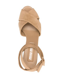 crossover suede platform sandals Expertly crafted in Italy from calf suede, these sandals from Miu Miu showcase the brand's playful yet refined aesthetic. Set atop a high block heel, the beige pair is punctuated with a bold platform sole and crossover straps. Highlights - Beige - Calf suede - Crossover strap at the toe - Open toe - Buckle-fastening ankle strap - Platform sole - High block heel Composition Suede 100% SIZE & FIT Measurement HEEL 3.74 in(9.5 cm) Sole height 1.18 in(3 cm)