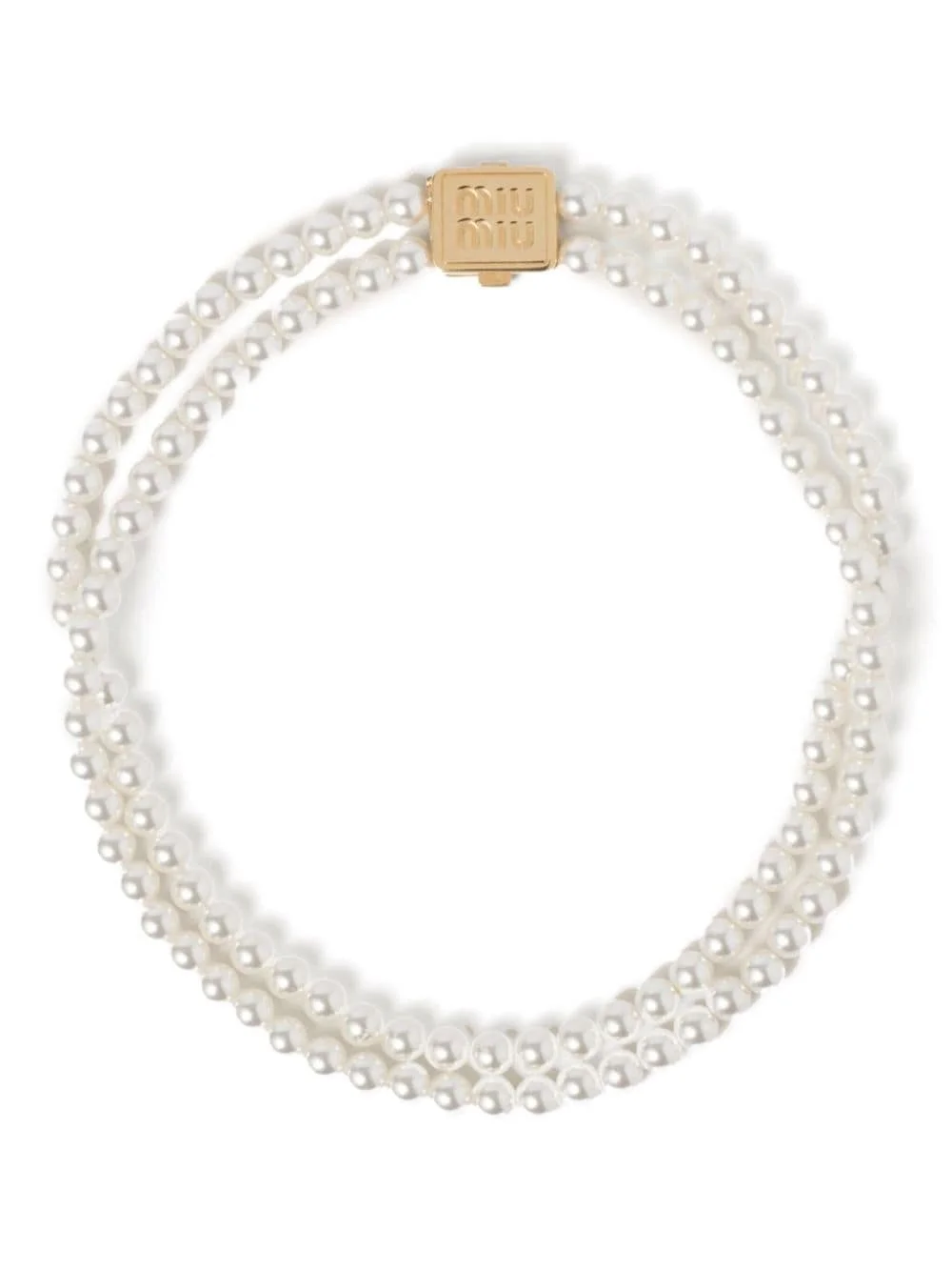 double-strand faux-pearl choker Highlights - White/gold-tone - Brass - Resin faux-pearl detailing - Logo-engraved gold-tone hardware - Clasp fastening - Bead chain