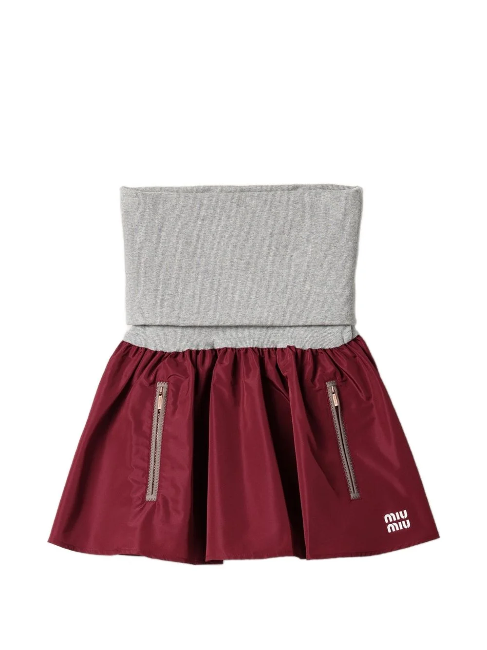 elastic-waist mini skirt Highlights - Burgundy and grey - Flared fit - Elasticised waistband - Metal zips - Logo detail Composition Recycled Polyester 100% Washing instructions Hand Wash