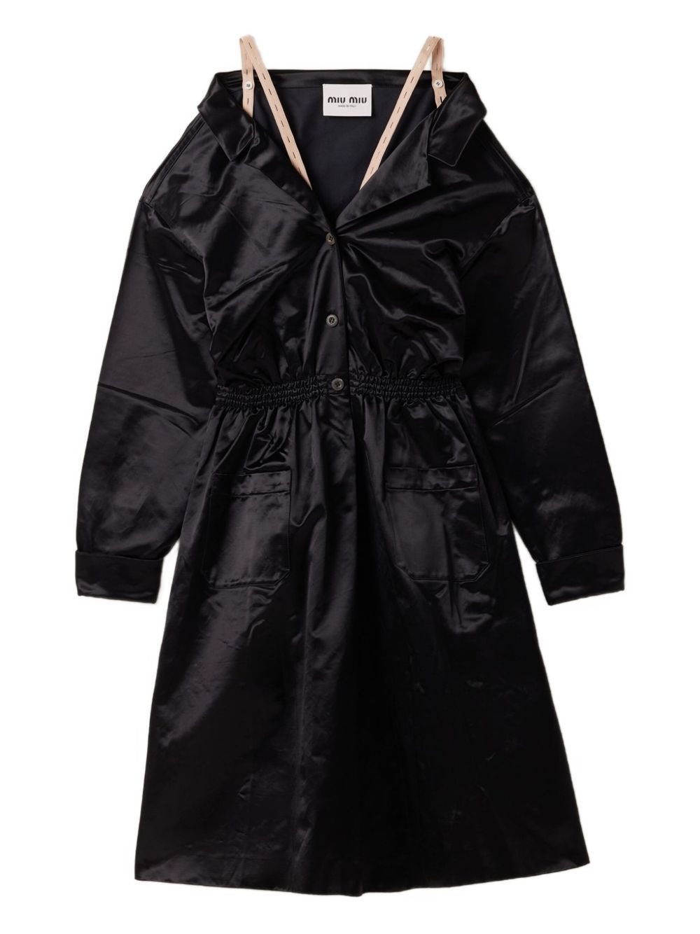 elastic-waist satin dress Highlights - Black - Satin - Shirt collar - Long sleeves - Button front fastening Composition Cotton 50%, Silk Velvet 50% Washing instructions Read Manufacturer Guidelines
