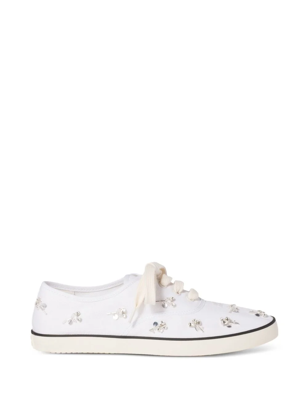 embroidered drill sneakers Highlights - A sparkling floral embellishment made of crystals enriches these drill sneakers, combining a sporty essence and experimental contrasts with a contemporary design typical of the miu miu wardrobe. - Upper with crystal-embellishments - Fabric lining - laces closure - rubber sole with logo - removable fabric-covered insole - Logo-embroidered on the upper and screen-printed on the insole Composition Outer: Fabric 100% Lining: Fabric 100% Sole: Rubber 100%