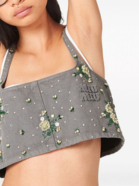 floral-embellished crop top This grey Miu Miu top juxtaposes a durable gabardine construction with delicate beaded florals and crystal embellishments. It’s cut to a cropped silhouette and detailed with a distressed logo at the chest. Highlights - Medium grey - Cotton - Gabardine weave - Garment dyed - Floral motif - Bead embellishment - Crystal embellishment - Applique logo - Thin shoulder straps - Square neck - Cropped - Straight hem Composition Cotton 100% Washing instructions Read Manufacturer Guidelines