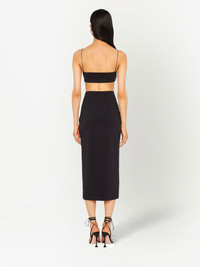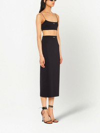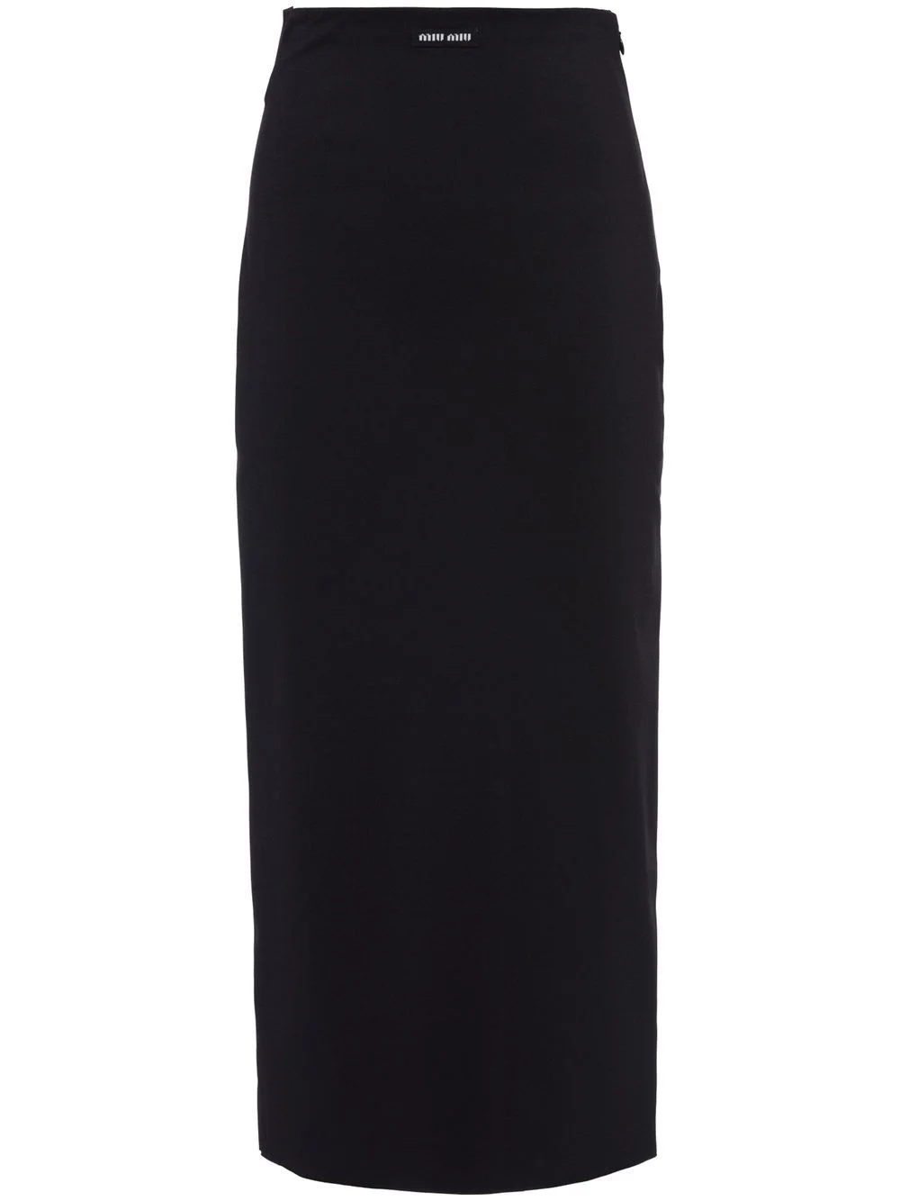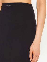 high-waist stretch midi skirt Miu Miu blends its signature delicate aesthetic with a contemporary feel in this midi skirt from the SS23 collection. The midi garment is imagined in a versatile black hue, complete with the iconic logo patch. Composition Polyamide 96%, Elastane 4% SIZE & FIT Measurement LENGTH 34.48 in(87.6 cm) WAIST 25 in(63.5 cm) HIPS 27.99 in(71.1 cm)