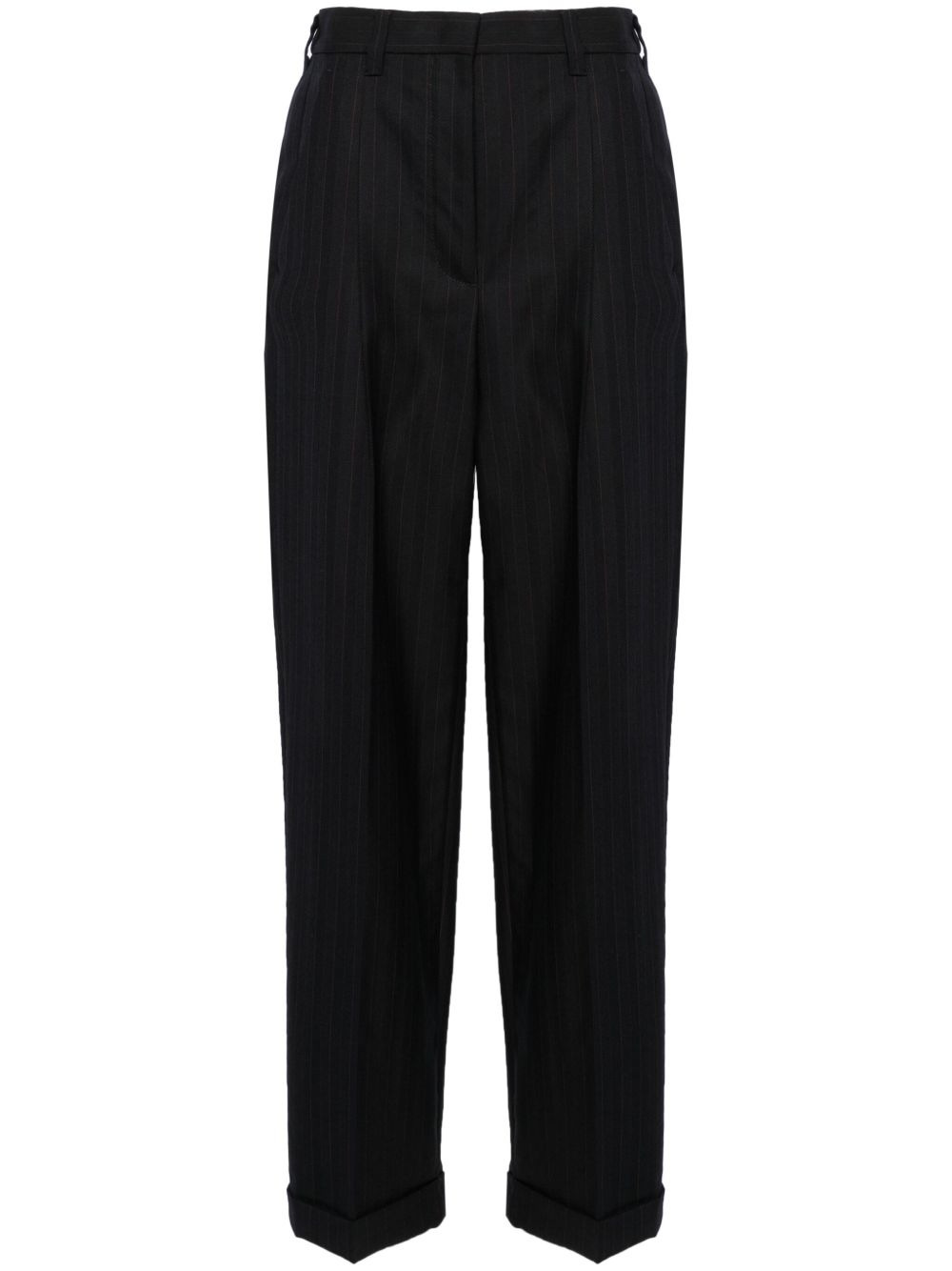 high-waisted pinstripe tailored trousers Highlights - Midnight blue/chocolate brown - Virgin wool - Pinstripe pattern - Herringbone pattern - Logo patches to the rear - Pleat detailing - Tailored cut - High-waisted - Concealed front button and hook fastening - Belt loops - Two diagonal pockets to the sides - Two rear button-fastening jetted pockets - Pressed crease - Turn-up hem Composition Outer: Virgin Wool 100% Lining: Viscose 100% SIZE & FIT Model measurements Height 5 ft 11 in(1.8 m) Bust/Chest 32.67 in(83 cm) Hips 36.22 in(92 cm) Waist 24.4 in(62 cm) FittingInformation Designed for a straight-leg fit, these trousers allow for a close fit at the waist and an unrestricted, comfortable fit over the leg The partially elasticated waistband offers increased movement and comfort at the waist Made from a midweight non-stretch fabric This piece fits true to size – take your usual size Washing instructions Dry Clean Only
