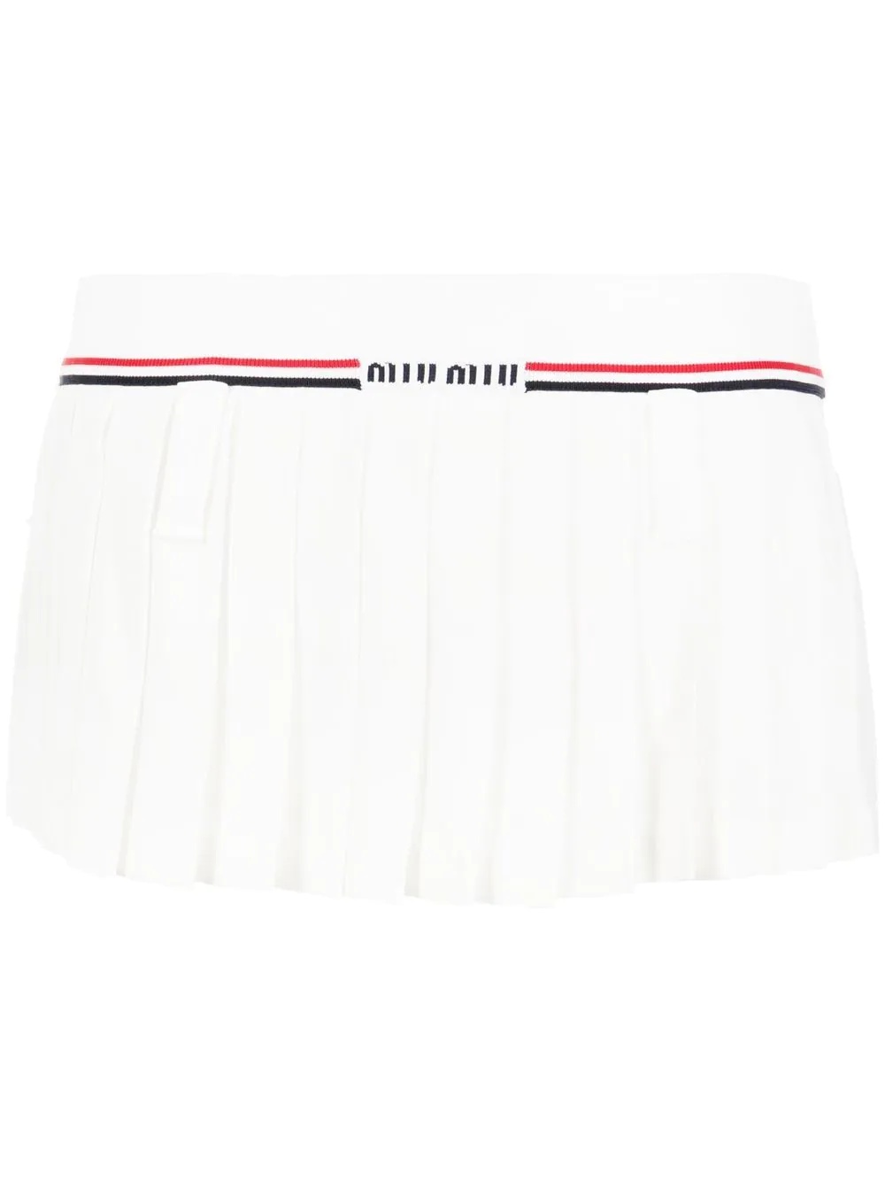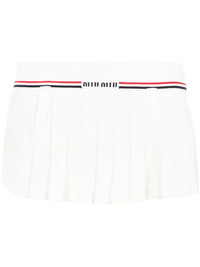 intarsia-logo pleated skirt white intarsia-knit logo fully pleated elasticated waistband above-knee length straight hem Composition Viscose 98%, Spandex/Elastane 2% SIZE & FIT Model measurements Height 5 ft 10 in(1.78 m) Bust/Chest 31.49 in(80 cm) Hips 37 in(94 cm) Waist 23.62 in(60 cm) FittingInformation This piece fits true to size. We recommend you get your regular size Designed for a loose fit with a close fit at the waist Made with a mid-weight stretch fabric Washing instructions Dry Clean Only