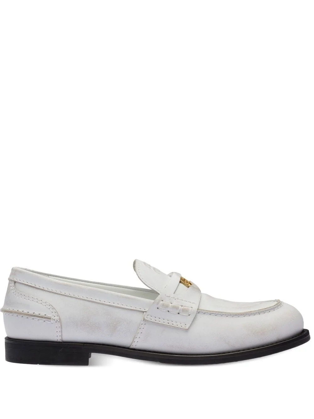 leather penny loafers These loafers from Miu Miu are presented in white leather with a scuffed effect. Featuring a coin detail within the penny slot, these loafers take inspiration from preppy looks of the past and pay homage to the trend of inserting a coin in one's loafers which gave rise to the name penny loafer itself. Composition Leather 100% SIZE & FIT Measurement HEEL 0.78 in(2 cm)