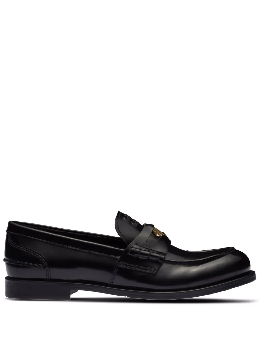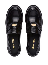 leather penny loafers These loafers from Miu Miu are presented in smooth black calf leather. Featuring a coin detail within the penny slot, these loafers take inspiration from preppy looks of the past and pay homage to the trend of inserting a coin in one's loafers which gave rise to the name penny loafer itself. Highlights - Black - Leather - Penny slot with penny detail - Gold-tone hardware - Round toe - Logo-embossed tongue - Branded insole - Flat rubber sole Composition Leather 100% SIZE & FIT Measurement HEEL 0.98 in(2.5 cm) Sole height 0.39 in(1 cm)