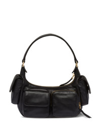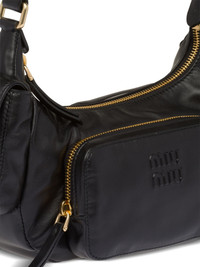 leather shoulder bag Miu Miu explores the boundaries between function and decoration for SS23, an aesthetic that's captured in the utility-inspired detailing that defines this black shoulder bag. It's crafted in Italy with multiple pockets and is finished with tonal logo lettering that adds a distinctive touch. Highlights - Black - Nappa leather - Embossed logo to the front - Gold-tone hardware - Single shoulder strap - Top zip fastening - Front zip-fastening pocket - Two side flap pockets - Main compartment - Internal zip-fastening pocket - Internal logo plaque Composition Outer: Nappa Leather 100% SIZE & FIT Measurement DEPTH 3.93 in(10 cm) HANDLE 7.87 in(20 cm) HEIGHT 3.54 in(9 cm) WIDTH 7.87 in(20 cm)