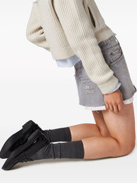 logo-embroidered denim miniskirt Cut in Italy to a relaxed fit, this skirt from Miu Miu is made from rigid cotton denim and defined by its exposed lining that adds a streetwear-inspired look to its thigh length. A tonal logo patch adorns its rear pocket for a recognisable look. Highlights - Grey - Cotton - Denim - Embroidered logo to the rear - Belt loops - Classic five pockets - Raw-cut hem - Thigh-length Composition Cotton 100% SIZE & FIT Measurement HIPS 34.01 in(86.4 cm) LENGTH 12 in(30.5 cm) WAIST 27.99 in(71.1 cm) Washing instructions Read Manufacturer Guidelines