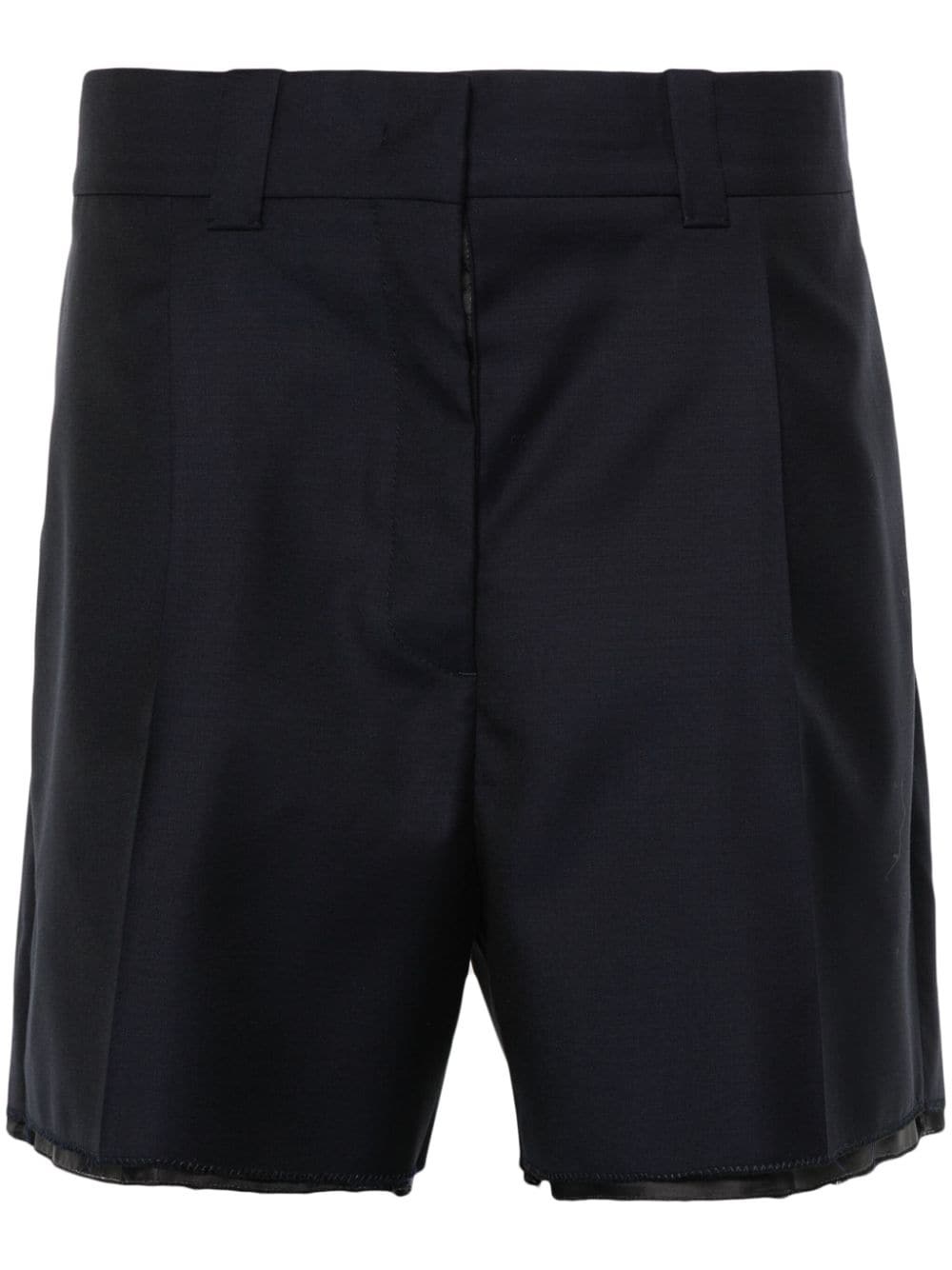 logo-embroidered wool shorts Highlights - Navy blue - Virgin wool - Twill weave - Embroidered logo to the rear - Pleat detailing - Pressed crease - Belt loops - Two diagonal pockets to the sides - Two rear patch pockets - Raw-cut hem - Concealed front hook and button fastening Composition Outer: Virgin Wool 100% Lining: Viscose 100% SIZE & FIT Model measurements Height 5 ft 9 in(1.75 m) Bust/Chest 34.64 in(88 cm) Hips 36.61 in(93 cm) Waist 26.37 in(67 cm) FittingInformation Designed for a loose fit, offering comfort and movement when worn Made from a midweight non-stretch fabric This piece fits true to size – take your usual size