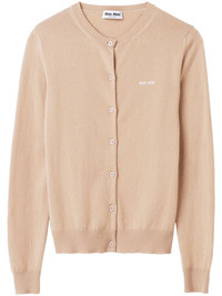 logo-intarsia fine-knit cardigan Miu Miu presents a refined take on a classic design with this cardigan. Crafted from cashmere, it arrives in a blush beige hue and boasts a contrasting intarsia-knit logo at the chest. Highlights - Blush beige/chalk white - Cashmere - Fine knit - Intarsia-knit logo - Crew neck - Front button fastening - Long sleeves - Ribbed cuffs and hem Composition Cashmere 100%