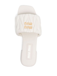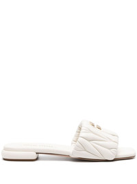 logo-lettering matelasse slides Highlights - White - Calf leather - Matelasse detailing - Gold-tone logo lettering - Slip-on style - Square open toe - Branded footbed - Flat sole - This piece comes complete with a protective dust bag. Composition Lining: Calf Leather 100% Outer: Nappa Leather 100% Sole: Calf Leather 100% SIZE & FIT Measurement HEEL 0.98 in(2.5 cm)