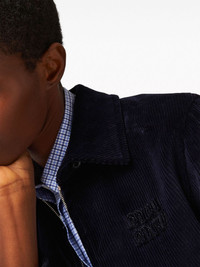 logo patch corduroy bomber jacket Made in Italy from heavyweight cotton worked into a utilitarian-inspired corduroy texture, this navy-hued bomber jacket taps into Miu Miu's youthful and contemporary take on outerwear. It is emblazoned with a tonal logo patch at the chest and fitted with an elasticated hem. Highlights - Navy blue - Cotton - Corduroy - Classic collar - Logo patch at the chest - Front zip fastening - Two side flap pockets - Long sleeves - Buttoned cuffs - Elasticated hem Composition Cotton 100% SIZE & FIT FittingInformation Designed for a relaxed fit, this piece allows for comfort and movement when worn The elasticated hem allows for movement and a comfortable fit Made from a midweight non-stretch fabric Washing instructions Read Manufacturer Guidelines