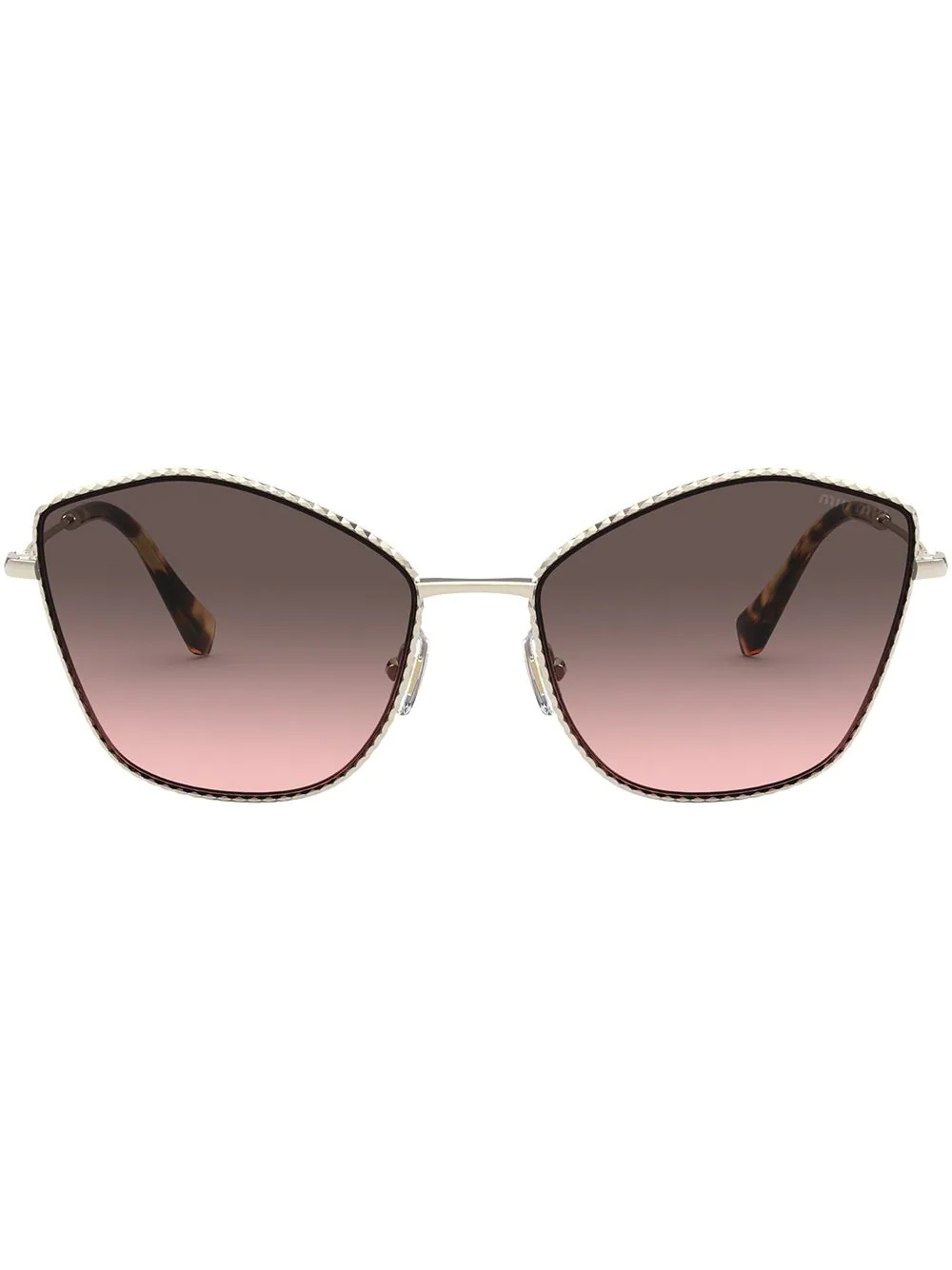oversize-frame gradient sunglasses Focus on what matters, like a good pair of sunglasses. It's clear that this Miu Miu design has caught your eye, with gradient lenses and an engraved logo at the arms. Here's looking at you. Composition Metal 100% SIZE & FIT Measurement Arm Length 5.51 in(14 cm) Bridge Width 0.7 in(1.8 cm) Lens Diameter 2.36 in(6 cm)