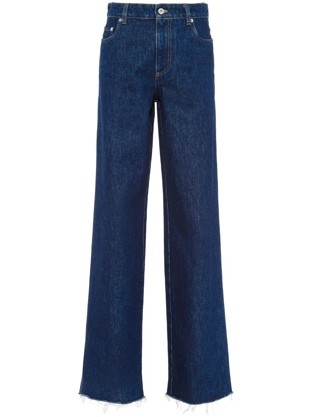 raw-cut straight-leg jeans Known as the little sister label to Prada, Miu Miu is known for its youthful spirit. Detailed with a raw-cut hemline, these low-rise jenas illustrate the brand’s penchant for fun designs. Highlights - Blue - Cotton - Denim - Low-rise - Contrast stitching - Embroidered logo to the rear - Button fly fastening - Belt loops - Classic five pockets - Straight leg - Raw-cut hem Composition Cotton 100%