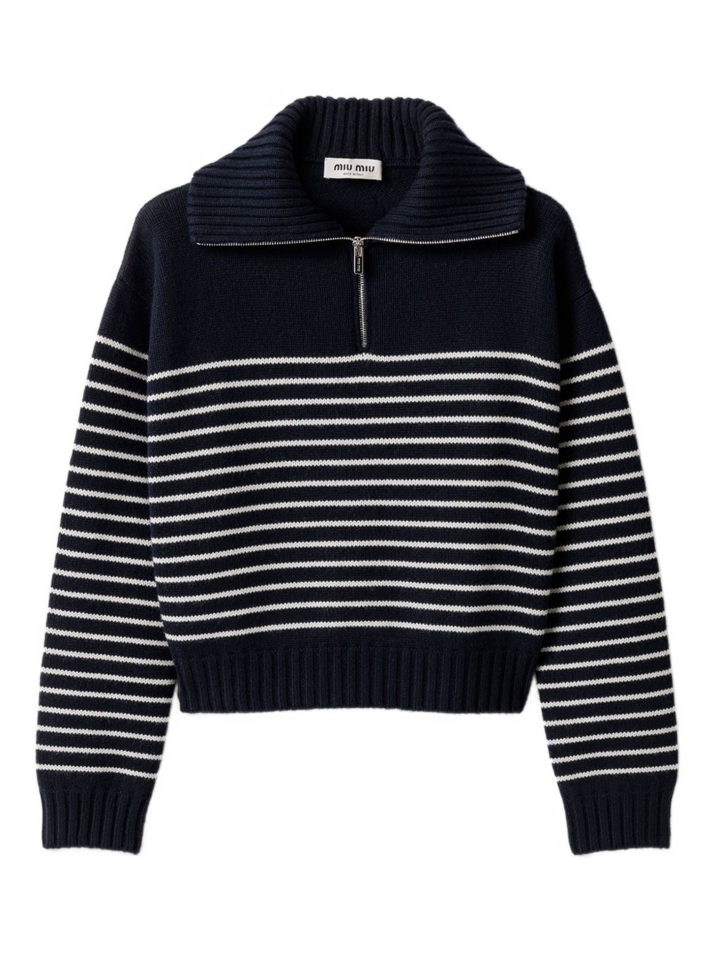 ribbed-collar striped sweater Highlights - Navy blue - Cashmere - Ribbed collar - Striped pattern - Long sleeves - Front zip closure Composition Cashmere 100%