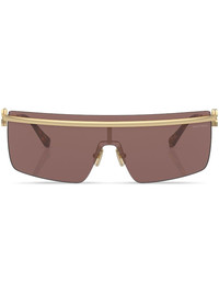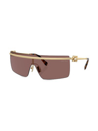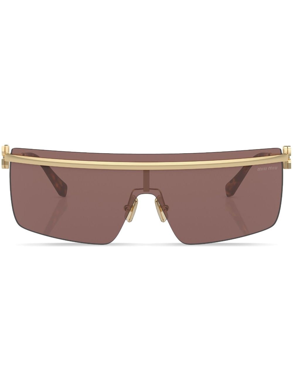 rimless tinted sunglasses The frameless, rimless design of these Miu Miu sunglasses lends a futuristic appeal, further emphasised by the gold-tone metal bar that wraps across the lenses into the arms. As a final touch, logo lettering is integrated at the temples. Highlights - Gold-tone - Metal - Logo plaque at the arm - Tortoiseshell-effect detailing - Frameless design - Rimless tinted lenses - Metal brow bar - Nose pads - Straight arms - Curved tips - These glasses come with a protective case. Composition Metal 100%