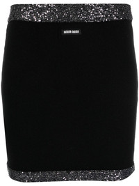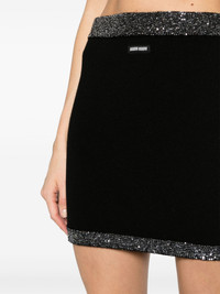 sequin-embellished miniskirt This black Miu Miu skirt is ribbed-knit with cashmere threads and embroidered with petit sequins at the waist and hem for a clash of texture and embellishment. A stitched logo applique at the front acts as the sole branded element. Highlights - Black - Cashmere blend - Ribbed knit - Sequin embellishment - Applique logo - Elasticated waistband - Thigh-length - Straight hem Composition Cashmere 92%, Polyamide 7%, Elastane 1% SIZE & FIT Model measurements Height 5 ft 9 in(1.76 m) Bust/Chest 33.07 in(84 cm) Hips 34.64 in(88 cm) Waist 25.59 in(65 cm) FittingInformation This mini-length skirt is intended to be worn just below the waist Made with a midweight knit, this piece offers some stretch This piece fits true to size – take your usual size Washing instructions Dry Clean Only