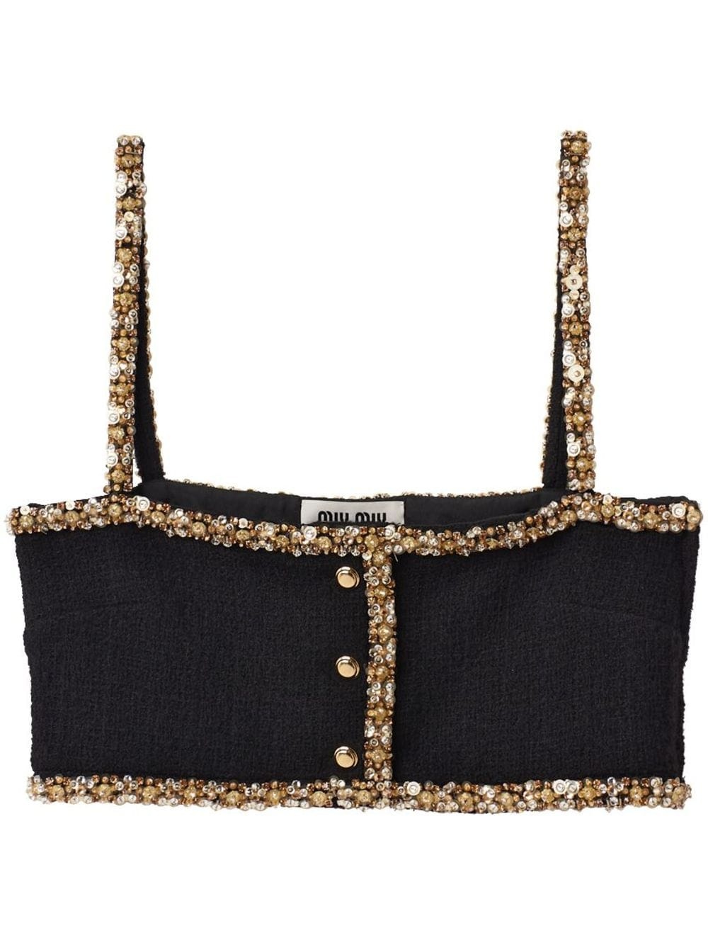 sequin-embellished tweed cropped top This black Miu Miu top juxtaposes a durable wool tweed construction with delicate sequin embellishments. It’s cut to a cropped silhouette and detailed with buttons at the front. Highlights - Black - Wool - Tweed - Sequin embellishment - Square neck - Front button fastening - Spaghetti straps - Cropped - Straight hem Composition Wool 100% Washing instructions Read Manufacturer Guidelines