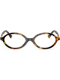 tortoiseshell-effect oval glasses Exuding a sophisticated air, these tortoiseshell-effect glasses by Miu Miu boast an oval frame with 'thin rims and ultra-flat lenses that highlight the extreme lightness'. Golden logo lettering is present at the temples for subtle embellishment. Highlights - Cedar brown - Acetate - Tortoiseshell effect - Logo plaque at the arm - Oval frame - Clear lenses - Straight arms - Curved tips - All glasses from farfetch are sold as non-prescription frames. - These glasses come with a protective case. Composition Acetate 100%