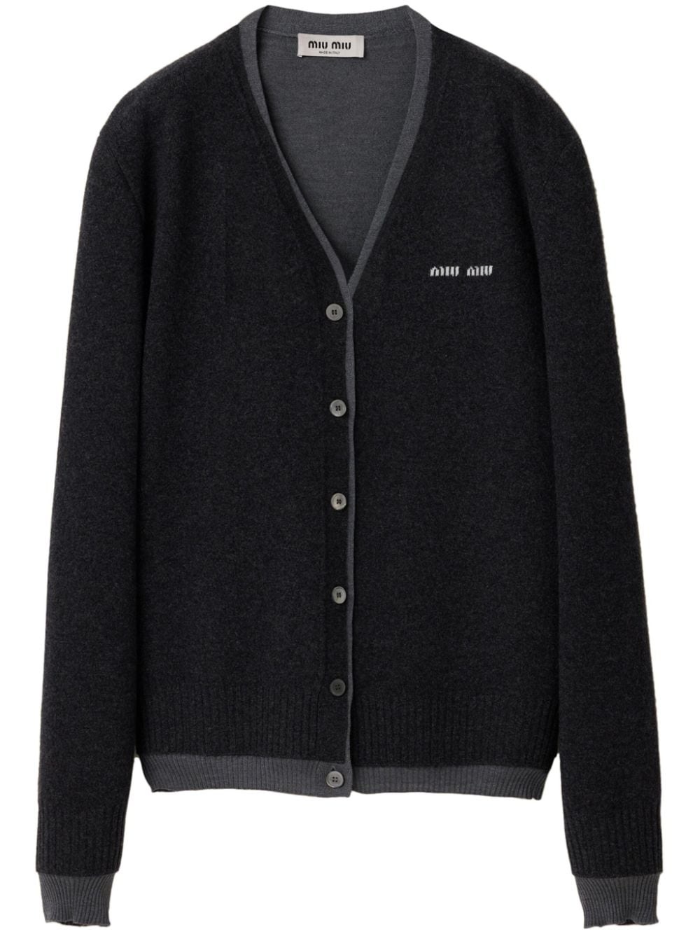 v-neck cardigan Highlights - Dark grey - Wool-silk blend - Fine knit - Embroidered logo at the chest - V-neck - Front button fastening - Ribbed cuffs and hem Composition Silk 100%, Wool 100%