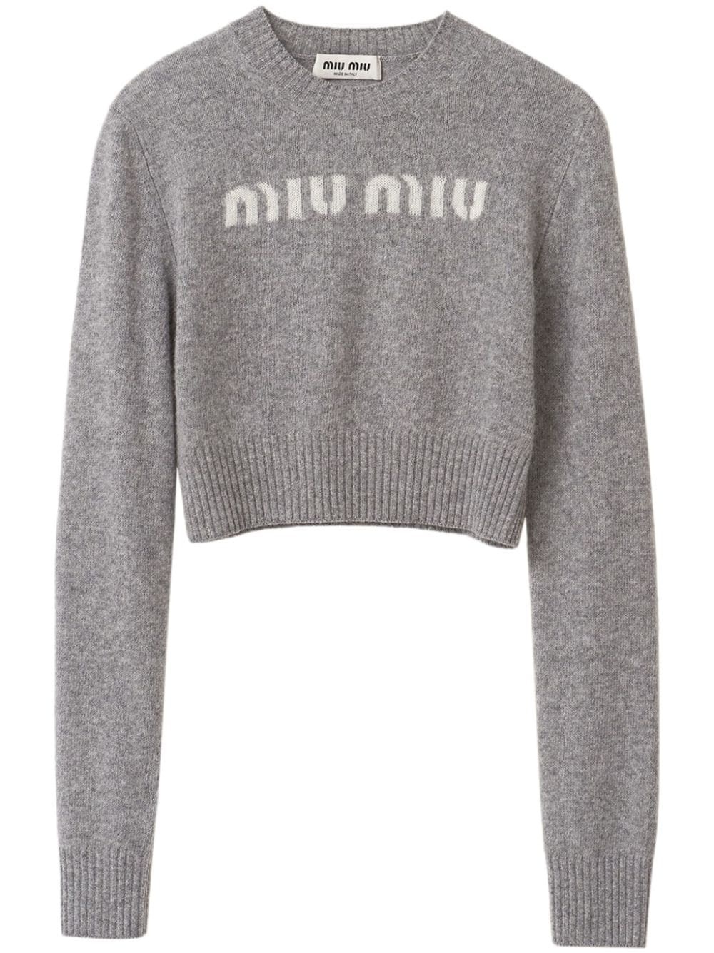 Wool and cashmere sweater Miu Miu takes a playful approach to knitwear in this grey jumper. It's crafted from virgin wool and cashmere to a slim, slightly cropped fit and is decorated with contrasting logo intarsia at the chest. Highlights - Plain knit cropped fit ribbed knit crew neck semi-raglan shoulder long sleeves ribbed knit cuffs and hem intarsia logocashmere Composition Virgin Wool 70%, Cashmere 30% SIZE & FIT FittingInformation Designed for a slim fit that sits just away from the body offering a close yet comfortable fit The ribbed hem offers a close, comfortable fit Made with a lightweight knit, this piece offers some stretch
