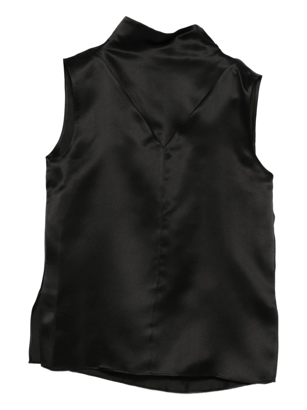 high-neck top Highlights - Black - Sleeveless - Side slits Imported Composition Silk 100% SIZE & FIT Model measurements Height 5 ft 10 in(1.78 m) Bust/Chest 31.49 in(80 cm) Hips 37 in(94 cm) Waist 23.62 in(60 cm) Washing instructions Dry Clean Only