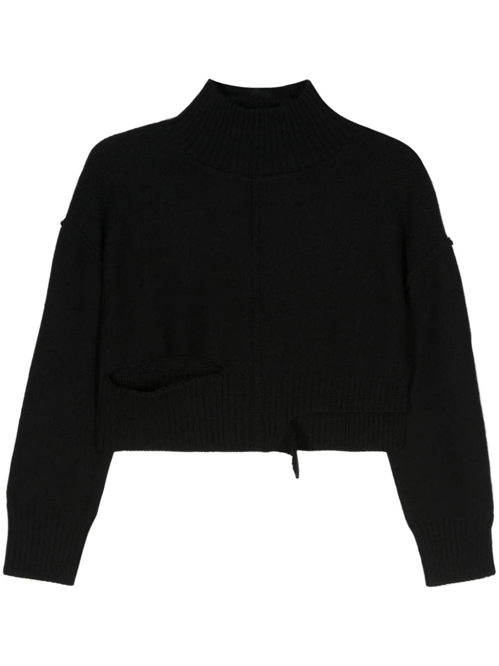 cut-out cropped jumper Highlights - Black - Virgin wool blend - Purl knit - Distressed effect - Inside-out effect seams - Ribbed high neck - Drop shoulder - Long sleeves - Front cut-out detailing - Cropped - Ribbed cuffs and hem - Rear signature single-stitch logo Made in Italy Composition Acrylic 50%, Virgin Wool 50% SIZE & FIT FittingInformation Designed to be unstructured, offering a loose fit throughout Made with a midweight knit, this piece offers some stretch This piece fits true to size – take your usual size