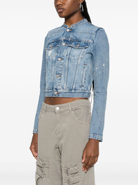 distressed denim jacket Highlights - Blue - Cotton - Distressed effect - Collarless - Long sleeves - Two button-fastening chest flap pocket - Two side welt pockets - Adjustable waist strap - Logo-engraved front button fastening Made in Italy Composition Cotton 100% SIZE & FIT Model measurements Height 5 ft 10 in(1.77 m) Bust/Chest 34.64 in(88 cm) Hips 35.43 in(90 cm) Waist 24.8 in(63 cm) FittingInformation Designed for a slim fit that sits just away from the body offering a close yet comfortable fit Cropped in length Sturdy and hard-wearing, this denim piece offers no stretch This piece fits true to size – take your usual size