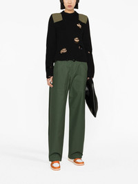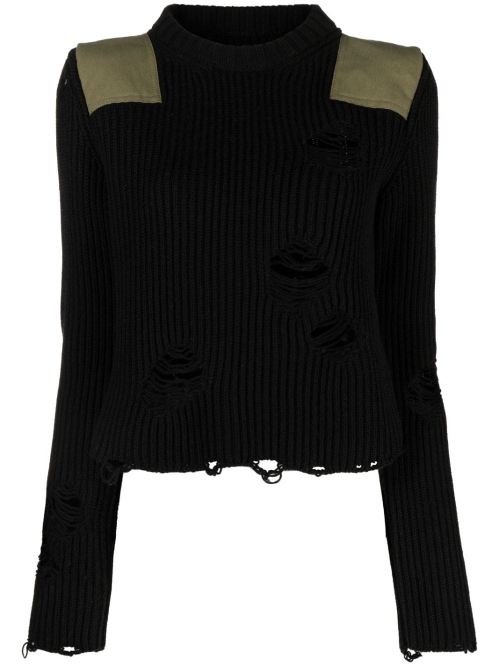 distressed ribbed jumper Imagined in black with olive green panels at the shoulder, this jumper pays homage to MM6 Maison Margiela's contemporary aesthetic. The labels presents a street-inspired take on knitwear with distressed detailing throughout. Highlights - Black/olive green - Cotton-wool blend - Chunky ribbed knit - Distressed finish - Crew neck - Long sleeves - Straight hem Imported Composition Cotton 85%, Wool 15% SIZE & FIT Model measurements Height 5 ft 10 in(1.78 m) Bust/Chest 29.92 in(76 cm) Hips 34.64 in(88 cm) Waist 23.62 in(60 cm) FittingInformation Designed for a relaxed fit, this piece allows for comfort and movement when worn Made with a midweight knit, this piece offers some stretch This piece fits true to size – take your usual size
