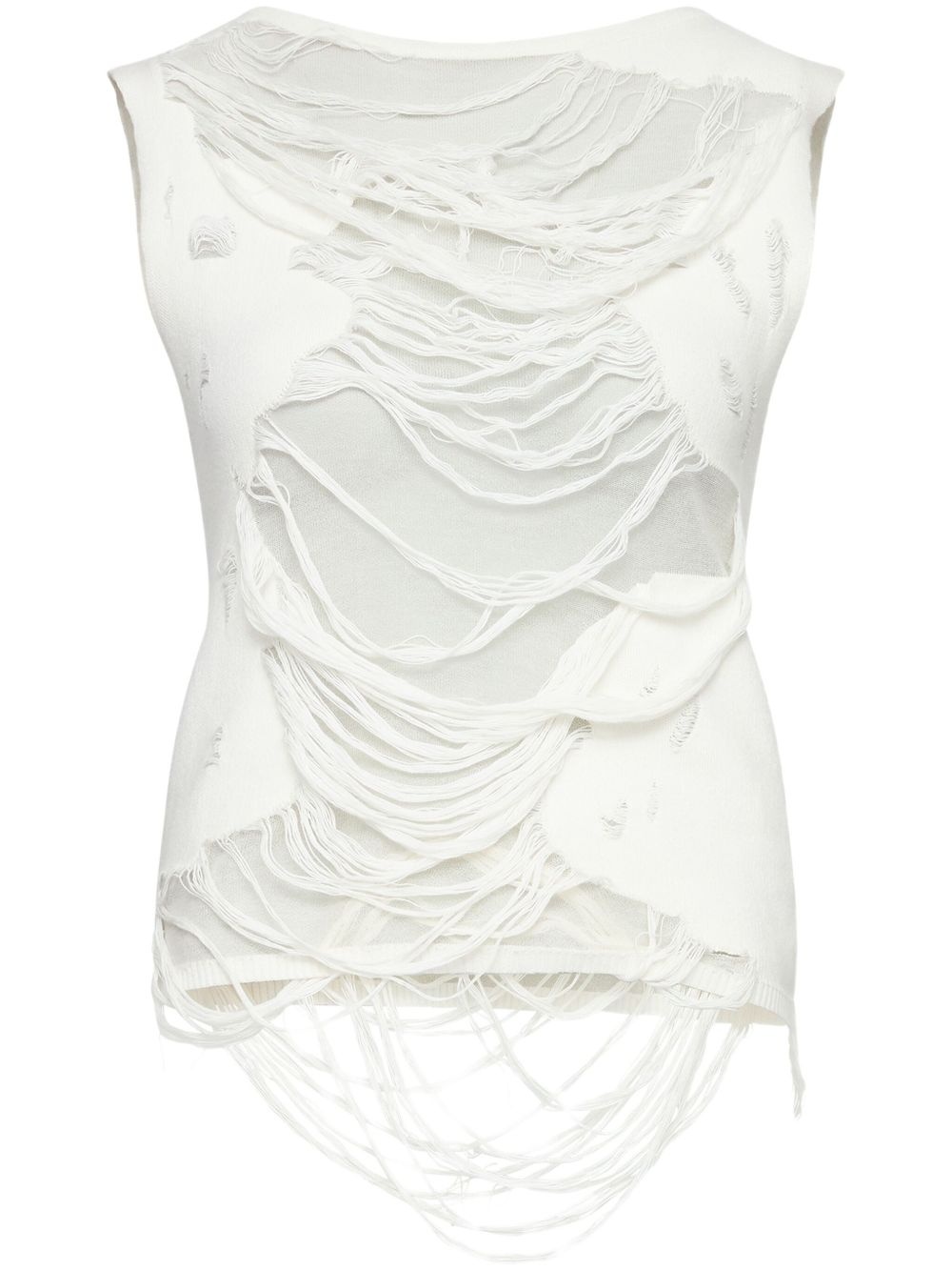 distressed top Highlights - White - Semi-sheer construction - Boat neck - Sleeveless Imported Composition Cotton 97%, Polyamide 3%