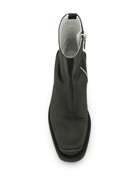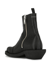 extended heel ankle boots Looking for a new pair of ankle boots? Then check-out this black extended heel pair from MM6 Maison Margiela. A classic with a twist. Highlights - Black - Leather/satin - White contrast stitching - Square toe - Side zip fastening - Pull tab at the heel - Extended back low block heel Made in Italy Composition Lining: Calf Leather 100% Sole: Leather 100% Outer: Satin 100% SIZE & FIT Measurement CIRCUMFERENCE 9.44 in(24 cm) HEEL 2.16 in(5.5 cm) HEIGHT 6.29 in(16 cm)