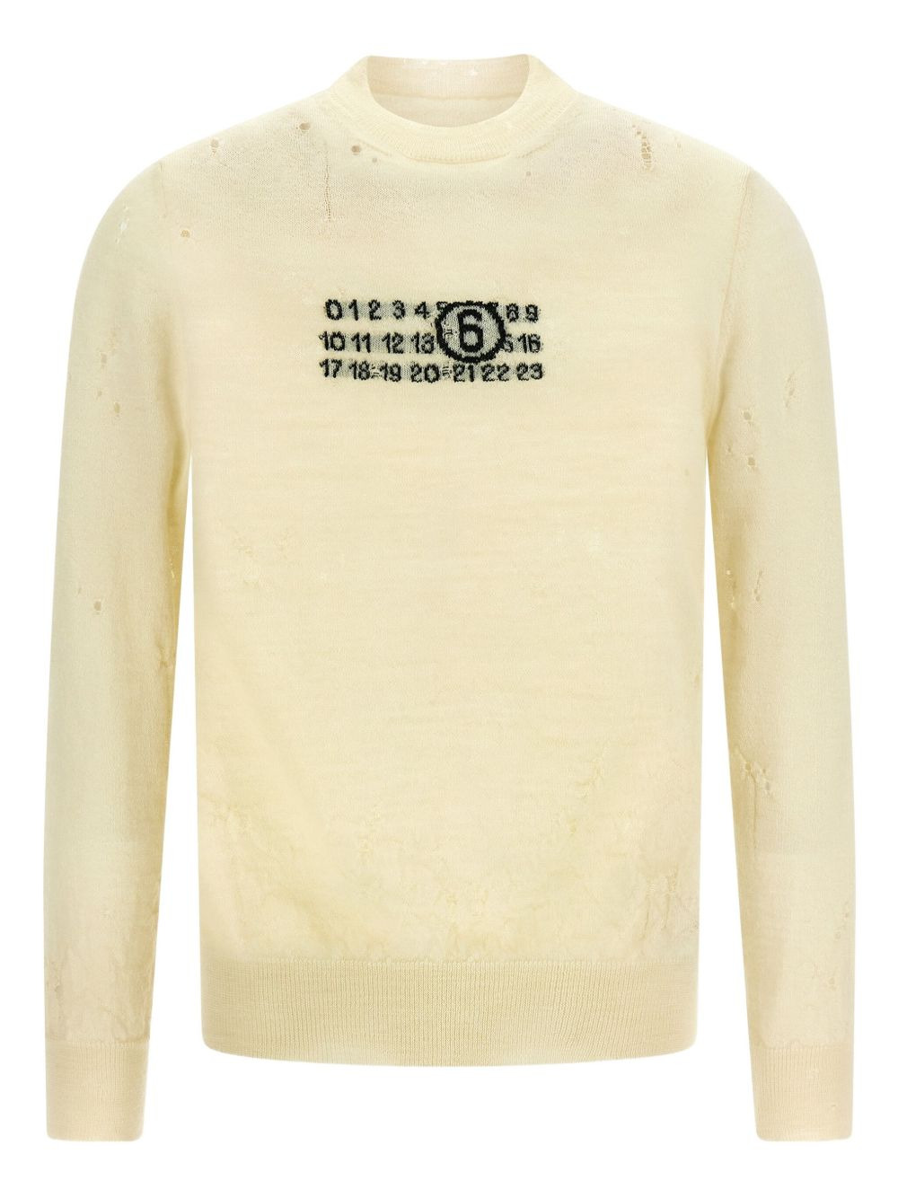 jacquard-detail distressed wool sweater Highlights - Beige - Distressed detailing - Numeric signature jacquard - Crew neck - Long cuffed sleeves - White-stitch back detail Made in Italy Composition Virgin Wool 100% Washing instructions Read Manufacturer Guidelines