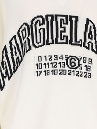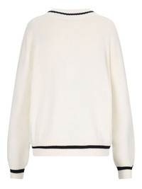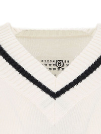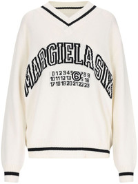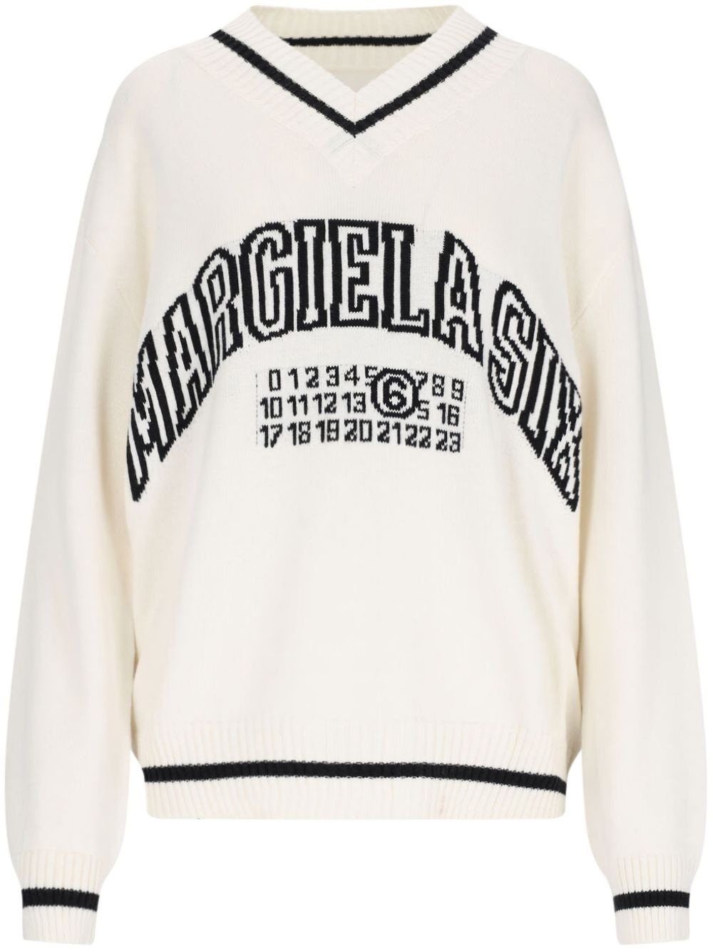logo-knit v-neck jumper Highlights - White - V-neck - Signature numbers motif - Striped edge - Ribbed cuffs and hem Imported Composition Cotton 85%, Wool 15%