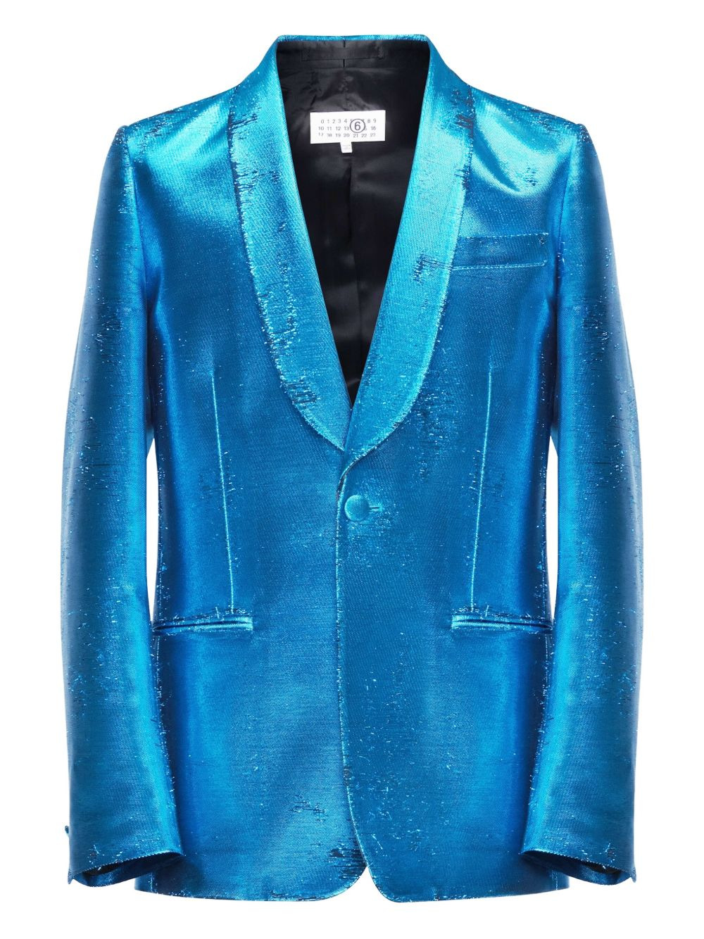 metallic shawl-lapel blazer Highlights - Bright blue - Metallic finish - Shawl lapel - Side pockets - Single-button closure Made in Italy Composition Acetate 52%, Cotton 32%, Polyester 16%