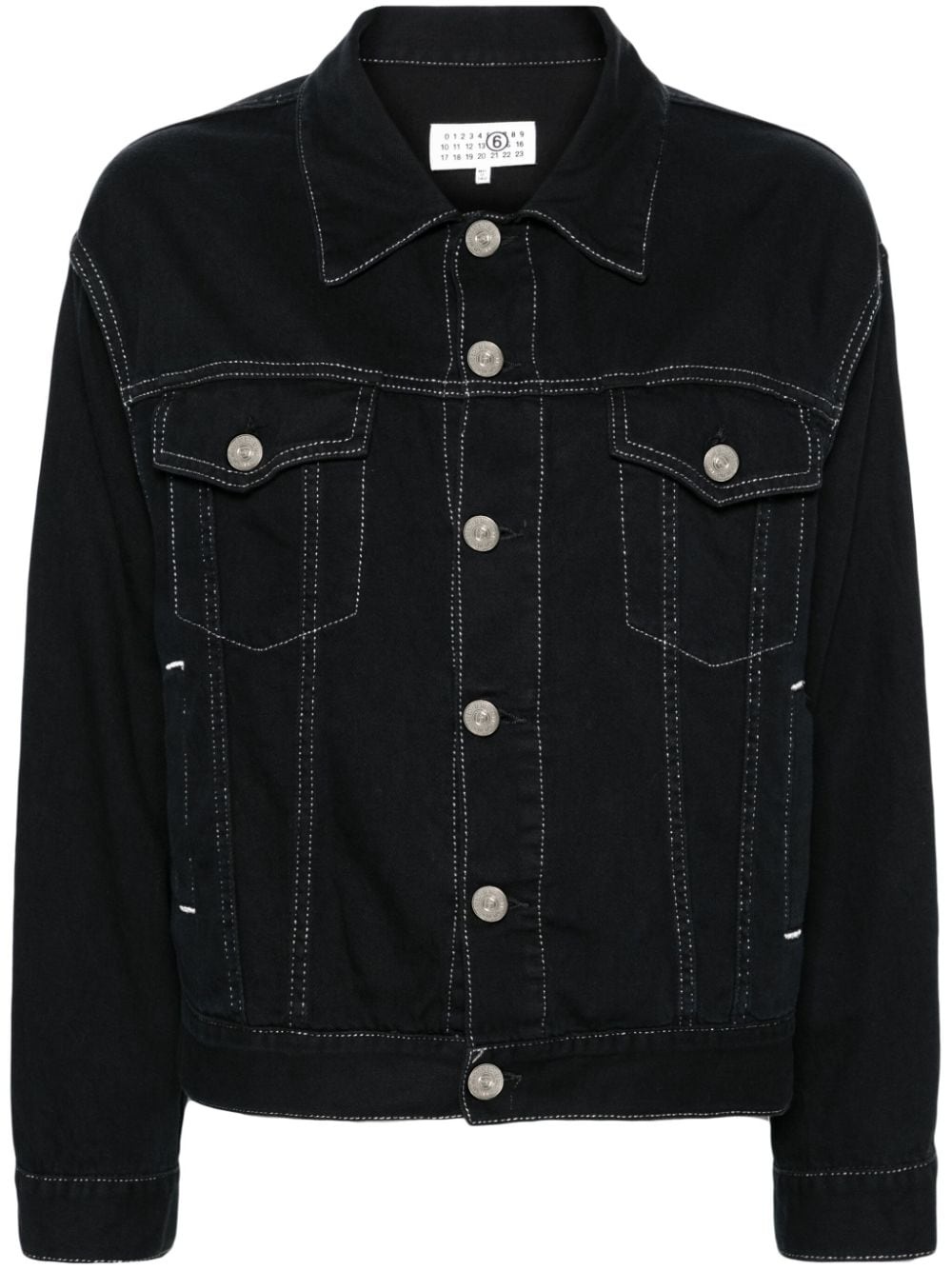 metallic-thread denim jacket Highlights - Black/white - Cotton - Denim - Metallic threading - Signature single-stitch logo - Cut-out detailing - Classic collar - Front button fastening - Drop shoulder - Long sleeves with buttoned cuffs - Two side welt pockets - Straight hem Made in Italy Composition Outer: Cotton 100% Lining: Polyester 65%, Cotton 35% SIZE & FIT Model measurements Height 5 ft 10 in(1.78 m) Bust/Chest 29.92 in(76 cm) Hips 34.64 in(88 cm) Waist 23.62 in(60 cm) FittingInformation Designed for a relaxed fit, this piece allows for comfort and movement when worn The adjustable tabs allow for fitted preferences Made from a midweight non-stretch fabric This piece fits true to size – take your usual size
