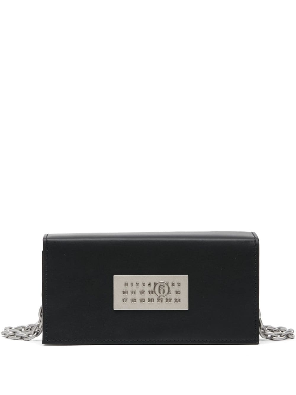 numbers-motif leather shoulder bag Highlights - Black - Calf leather - Smooth grain - Chain-link shoulder strap - Foldover top - Signature numbers motif plaque - Rear signature single-stitch logo - Main compartment - Internal card slots - Silver-tone hardware - Concealed magnetic fastening Imported Composition Lining: Polyurethane 76%, Polyester 17%, Viscose 7% Outer: Calf Leather 100% SIZE & FIT Measurement DEPTH 1.37 in(3.5 cm) HEIGHT 3.54 in(9 cm) STRAP 23.62 in(60 cm) WIDTH 7.08 in(18 cm)
