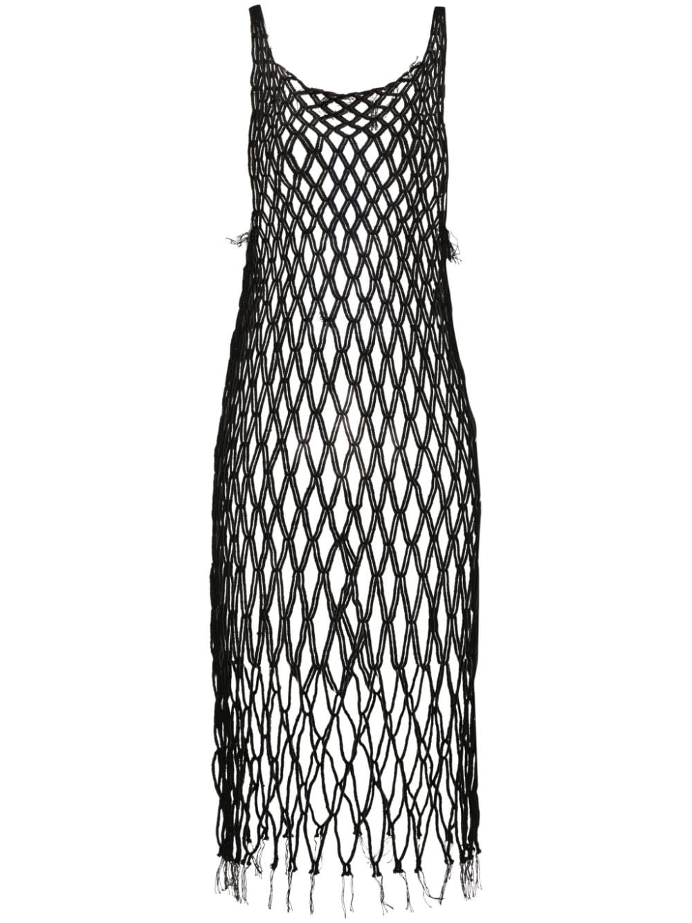 open-knit midi dress Highlights - Black - Cotton blend - Semi-sheer construction - Open knit - Scoop neck - Sleeveless - Fringed edge - Mid-length - Unlined Imported Composition Cotton 70%, Polyester 25%, Other fibres 5%