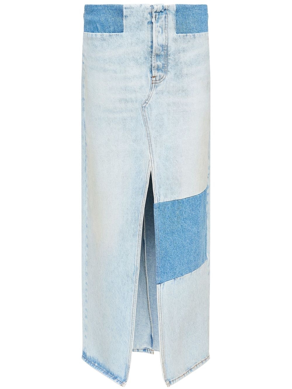 patchwork denim skirt Highlights - Light blue - Concealed front fastening - Two rear patch pockets - Front slit - Rear slit Made in Italy Composition Cotton 100%